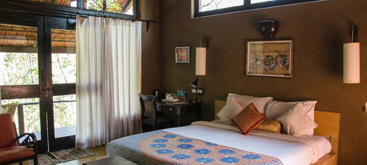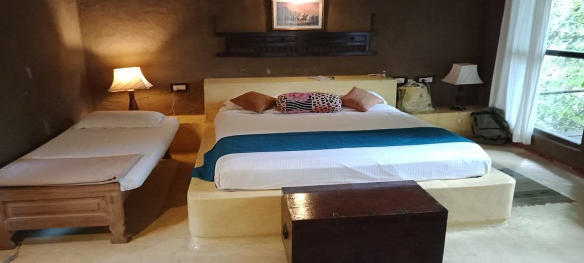 In total, Mahua Vann Resort has 12 spacious suites that comprise of 15 fully-equipped rooms. These rooms are equipped with some modern basic amenities like air conditioning, tea/coffee maker machine, wardrobe, study table, water bottle, attached bathroom with modern toiletries. There are three types of accommodation options at Mahua Vann Resort; Deluxe, Super Deluxe, and Machan Cottage. The deluxe rooms cover an area of 300-400 sq ft with a balcony and attached bathrooms. Whereas, the super deluxe cottages cover a floor area of 400 sq ft with attached bath and balcony. These cottages are perfect for couples and small families. On the other hand, machan cottage is spread over in an area of 400-450 sq ft and includes a thatched terrace. The machan cottage also includes a separate living area along with an attached bath and a balcony.